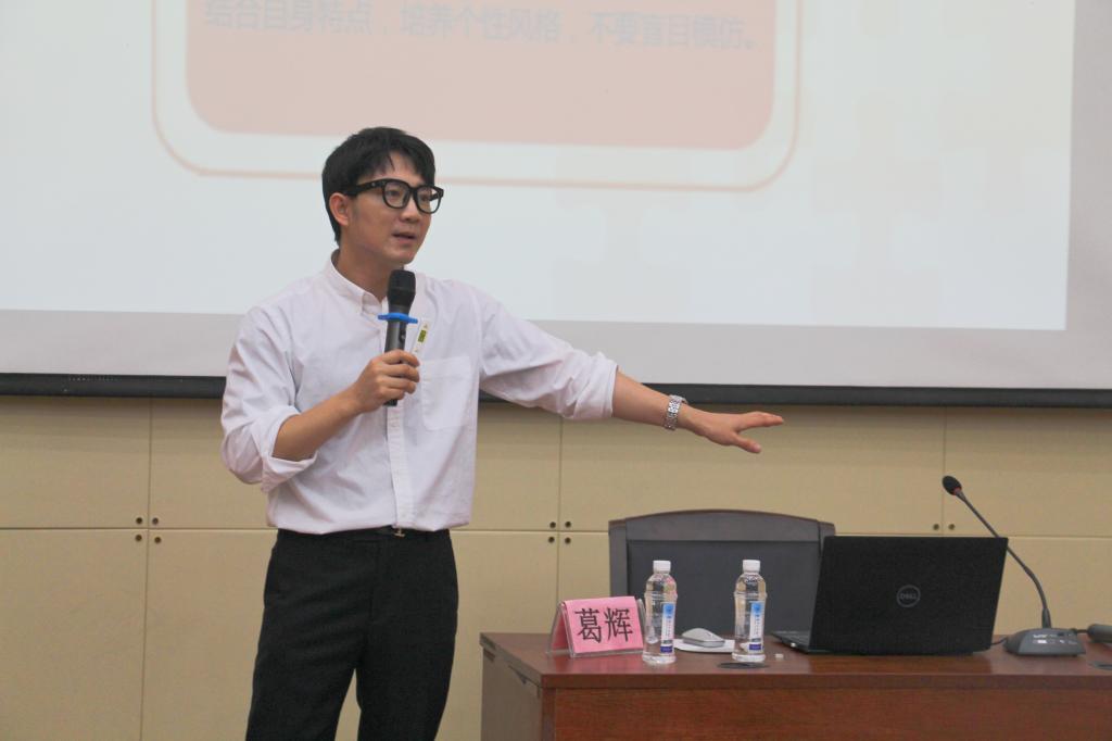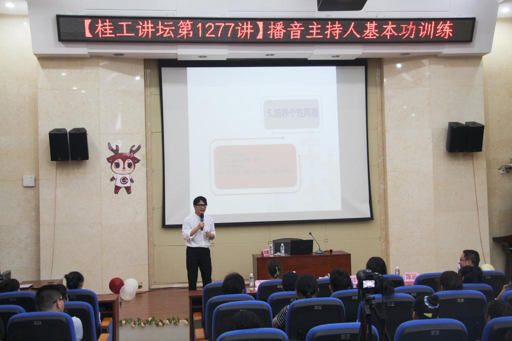 葛辉是国家一级播音员,现担任广西电视台《美丽广西》、桂林电视台《天气预报》主持人。在此次讲座,葛辉老师凭借着他在主持界多年积累的经验和丰富的阅历,给同学们讲解以及分析了自己亲身经历以及实际操作过的案例,并围绕着主持人的基本条件、主持人的准备工作、主持人的临场技巧三个专题进行了详细的解答。