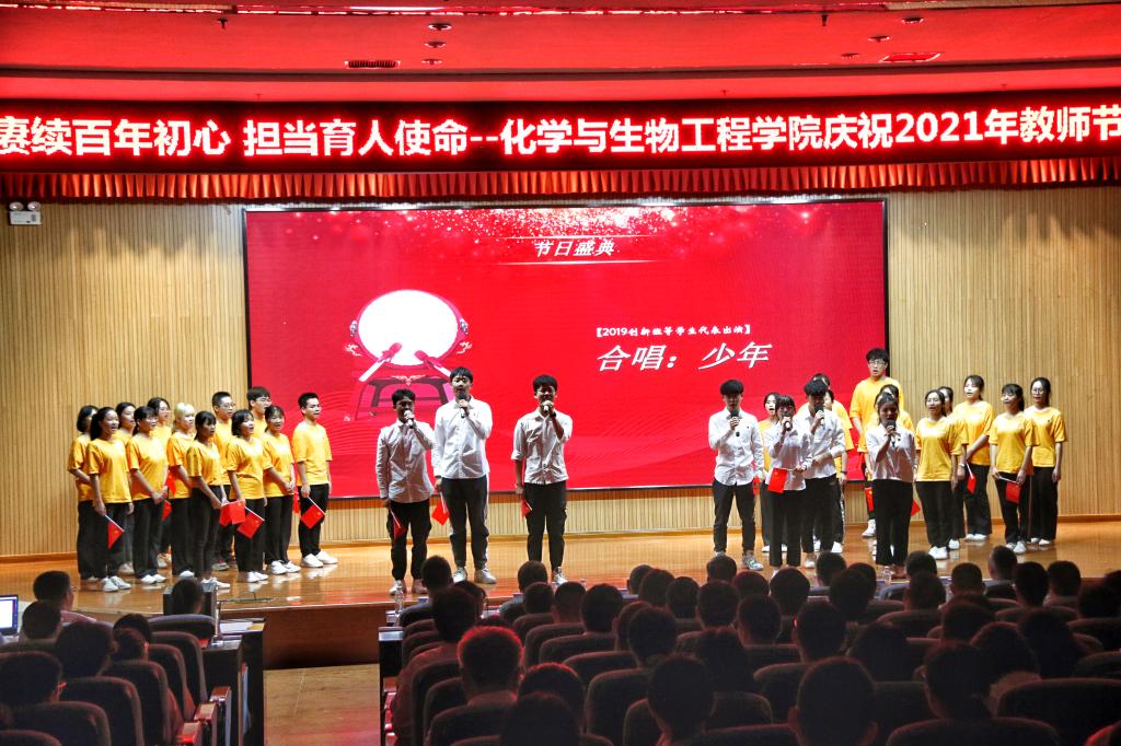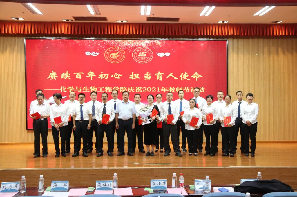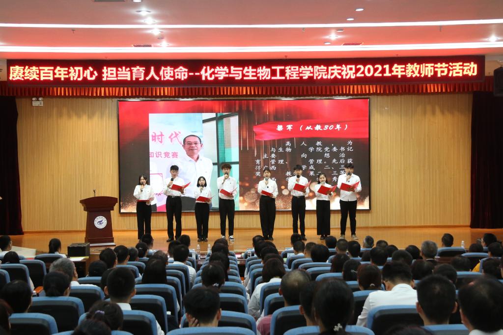 为深入贯彻落实党的十九大和十九届二中、三中、四中、五中全会精神以及习近平总书记关于教育系列重要论述精神,展现学院教师爱党爱国、仁爱奉献的精神风貌,进一步增强广大教师和教育工作者的光荣感和使命感,化学与生物工程学院以庆祝中国共产党成立100周年和第37个教师节为契机,于9月7日上午在雁山校区图书馆报告厅开展以“赓续百年初心 担当育人使命”为主题的教师节庆祝活动。学校党委常委、副校长梁福沛、学院党委书记梁军、院长匡小军以及学院全体教师、学生代表等220余人参加了本次活动。