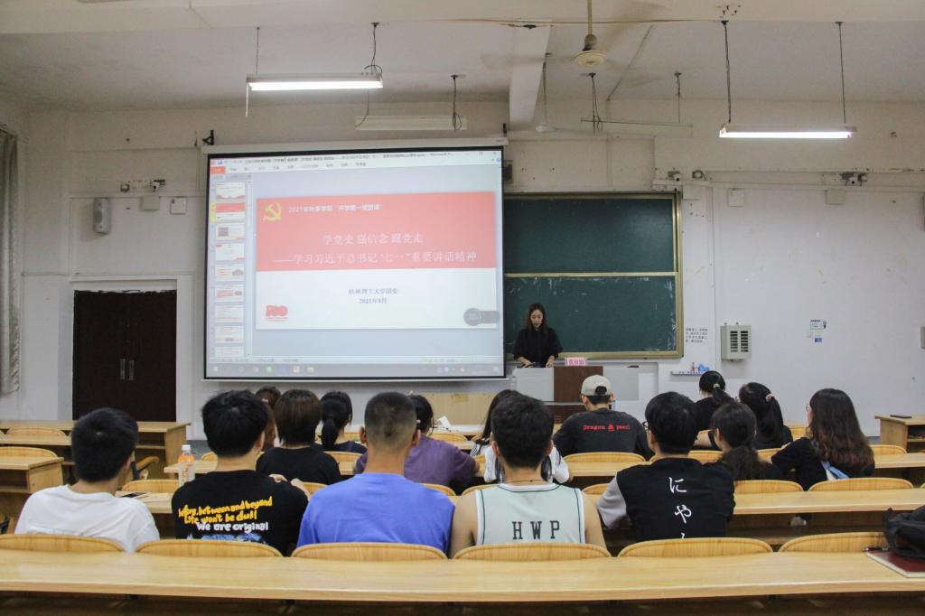 为深入贯彻习近平总书记重要讲话精神,传承红色基因,推动广大学生学党史、强信念、跟党走。2021年9月9日,公共管理与传媒学院于beats365亚洲版雁山校区06105教室开展了2021年秋季学期“开学第一堂团课”。团课由管媒学院团委副书记(兼)莫田娟主讲,学工办老师朱晓、团委、学生会全体成员参与学习。
