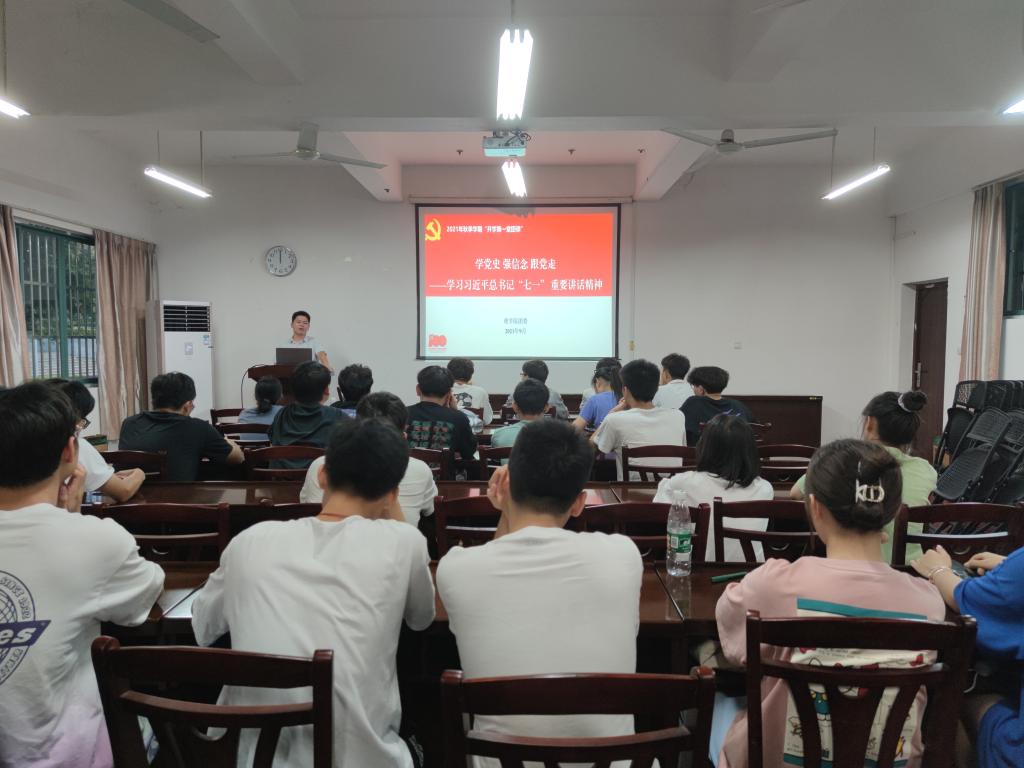 9月23日晚上,理学院组织团委、学生会等团学骨干40余名同学在07122会议室开展开学第一堂团课学习活动,学习习近平总书记“七一”重要讲话精神,团课由学院团委副书记舒强老师领学。