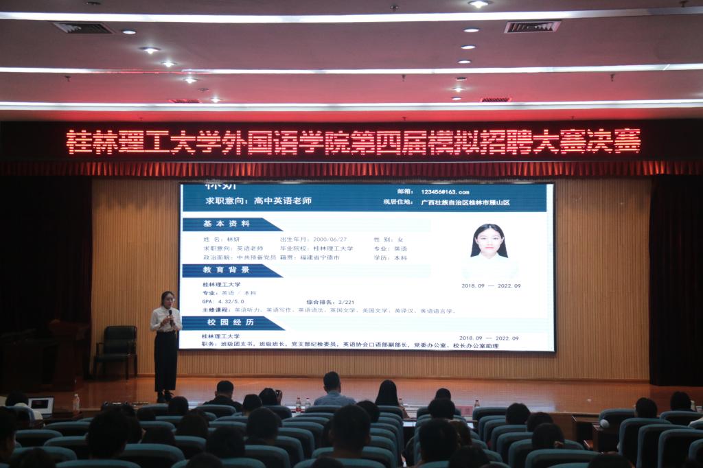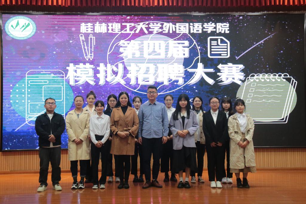 10月13日晚上7点半,外国语学院在雁山校区图书馆报告厅顺利举行beats365亚洲版外国语学院第四届模拟招聘大赛。此次大赛特邀到桂林康辉国际旅行社有限公司经理关志远、学院党委副书记邓洁琼、学院2018级辅导员梁璇、2019级辅导员姚倩、学院研究生辅导员兼2020级日语辅导员王好男担任评委和嘉宾出席本次大赛。外国语学院学生积极到场观赛。