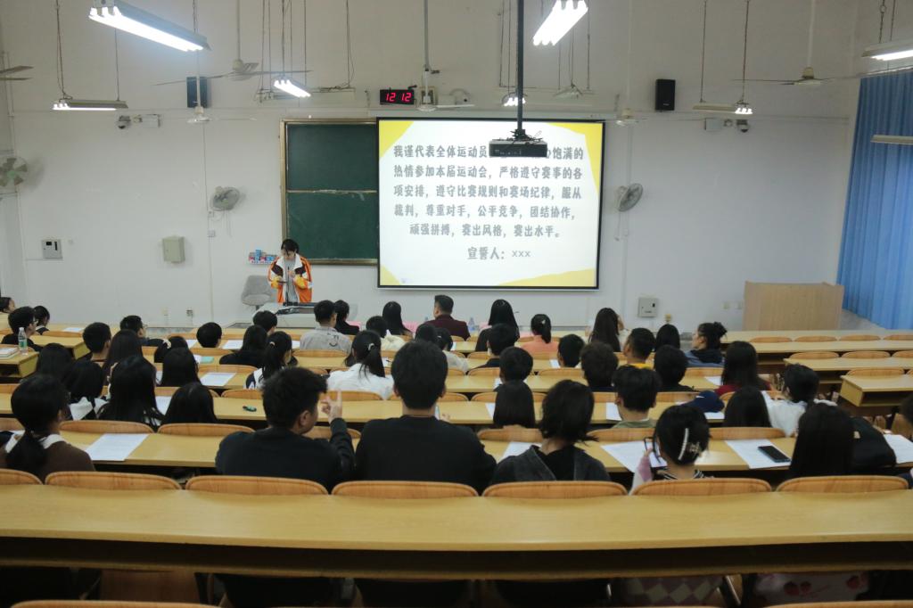本次大会共有三个环节。运动员进场签到后,主持人宣布大会开始。随后,邓洁琼老师上台讲话,她围绕参与运动会目的和意义、竞技精神、赛场文明、赛场安全以及有关赛场突发问题的处理方法等方面进行了详细的说明。之后由运动员代表韩笑同学带领全场运动员宣誓。最后,运动员们集体签署安全保证书。至此,本次大会顺利结束。