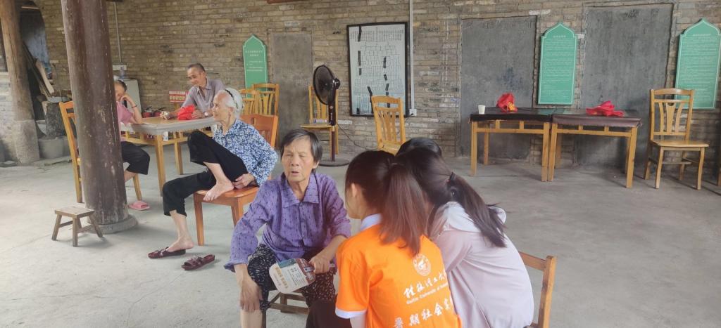 七月盛夏,调研团队首先来到潜经村白氏宗祠参观,宗祠共分前后三进,布局层次有序,虽经过几百年的风雨侵蚀,有些破败,但仍掩饰不住昔日的繁盛和建筑的宏伟,绿荫簇拥下的宗祠,给人一种肃穆神圣的感觉。走入宗祠,看到许多老人在里面休闲娱乐,有棋牌桌、电视机等娱乐设备,丰富了老年人的日常生活。宗祠里一位老奶奶慈祥地告知团队成员,村里的老人有空的时候都会来这消遣娱乐的,偶尔还会有康复疗养中心健康义诊活动,免费给老人家提供健康疗养服务。我们也认识到办好农村养老,不断完善养老基础设施建设,实现农村老人们对美好晚年生活的期盼,才能更好促进乡村振兴。