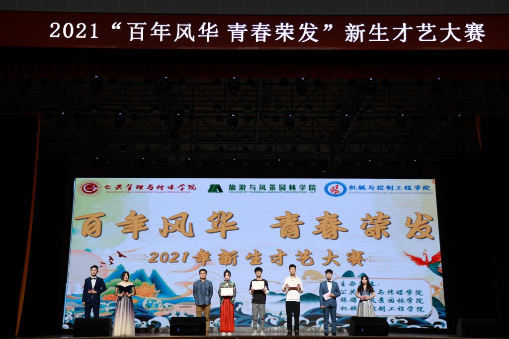 为庆祝党的百年华诞,展示青春的蓬勃朝气,公共管理与传媒学院和旅游与风景园林学院、机械与控制工程学院在11月5日晚于雁山校区新体育馆共同举办主题为“百年风华,青春荣发”的新生才艺大赛。 管媒学院党委副书记杨晓、团委副书记(兼)莫田娟、2021级辅导员朱晓出席本次比赛并担任评委。