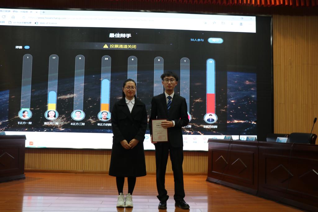 最终,通过双方精彩绝伦的辩论,地学院辩论队以压倒性优势拿下最终冠军,四辩2020级资源与环境专业谢维安同学获得“最佳辩手”称号。