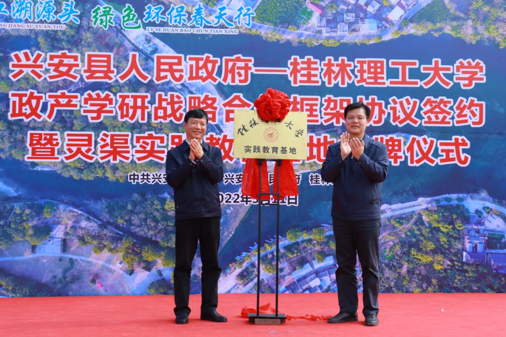 活动前,环境科学与工程学院的师生们共同见证了我校联合兴安县人民政府共同举行的政产学研战略合作框架协议签约暨灵渠实践教育基地揭牌仪式。