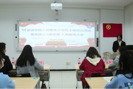 为规范学院各团支部开展优秀团员入党推优工作,扣好优秀团员入党第一颗纽扣,3月22日下午,外国语学院团委在04305会议室举办外国语学院入党推优示范性主题团日活动。学院党委副书记邓洁琼、学院团委副书记(主持工作)黎云鹏、学院党建组织员陈欣、学院团委副书记兼18级辅导员梁璇、19级辅导员姚倩、20级辅导员李林军和王好男、英语21-5班班主任王枫博出席本次活动。学院学生党员代表、各班团支书、团委组织部工作人员、英语2021-5班团支部全体团员和群众参加本次活动。