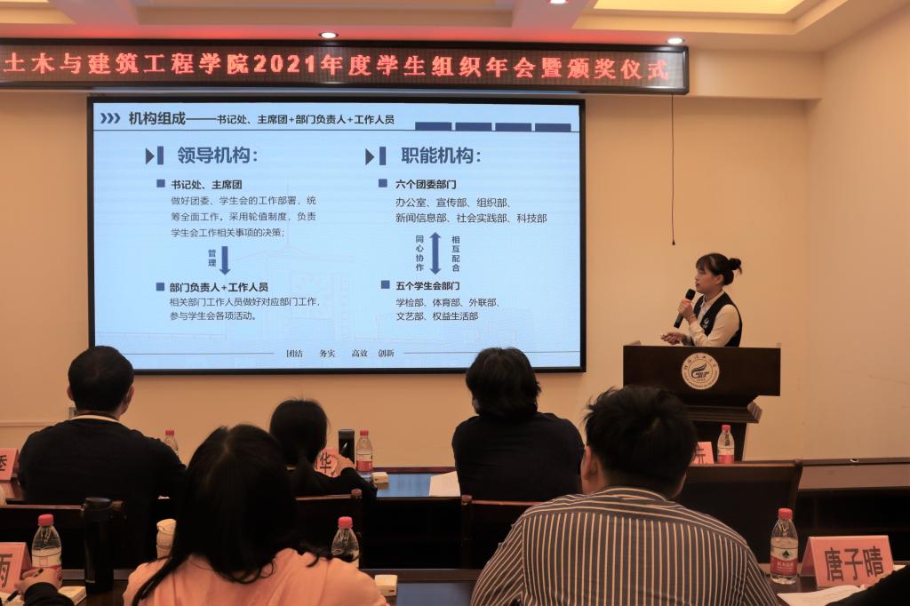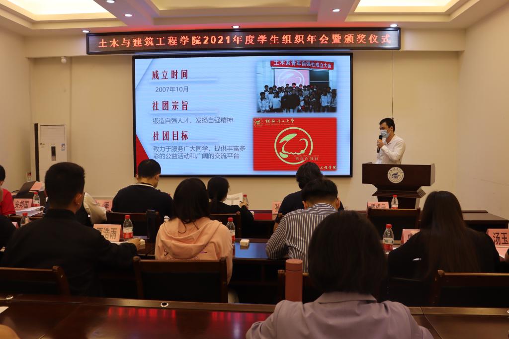 年会伊始,土木与建筑工程学院各学生组织依次进行2021年学生组织工作答辩与展示,对2021年的工作开展情况、主要工作成绩、存在的不足等进行总结汇报,并对2022年的重点工作与目标进行规划。随后,学院团委副书记(兼)安邦国老师宣读《关于表彰土木与建筑工程学院2021年度“优秀学生工作者”的决定》,并由社团指导老师为学院优秀学生工作者颁奖;根据各学生组织材料总结情况和现场答辩情况综合评选出优秀学生组织三个,并由学院党委副书记唐丽华老师为优秀学生组织颁奖。
