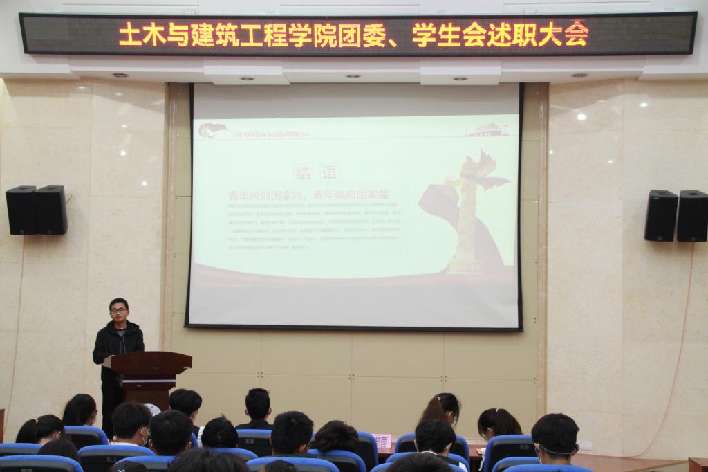 为进一步加强学生干部队伍建设,贯彻落实团委、学生会各项规章制度,土木与建筑工程学院于4月16日在雁山校区12栋萃华楼报告厅组织2022年团委、学生会述职大会,学院团委副书记(兼)安邦国老师列席会议,学院团委、学生会全体成员参加会议。