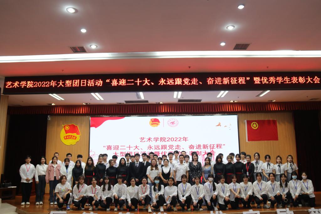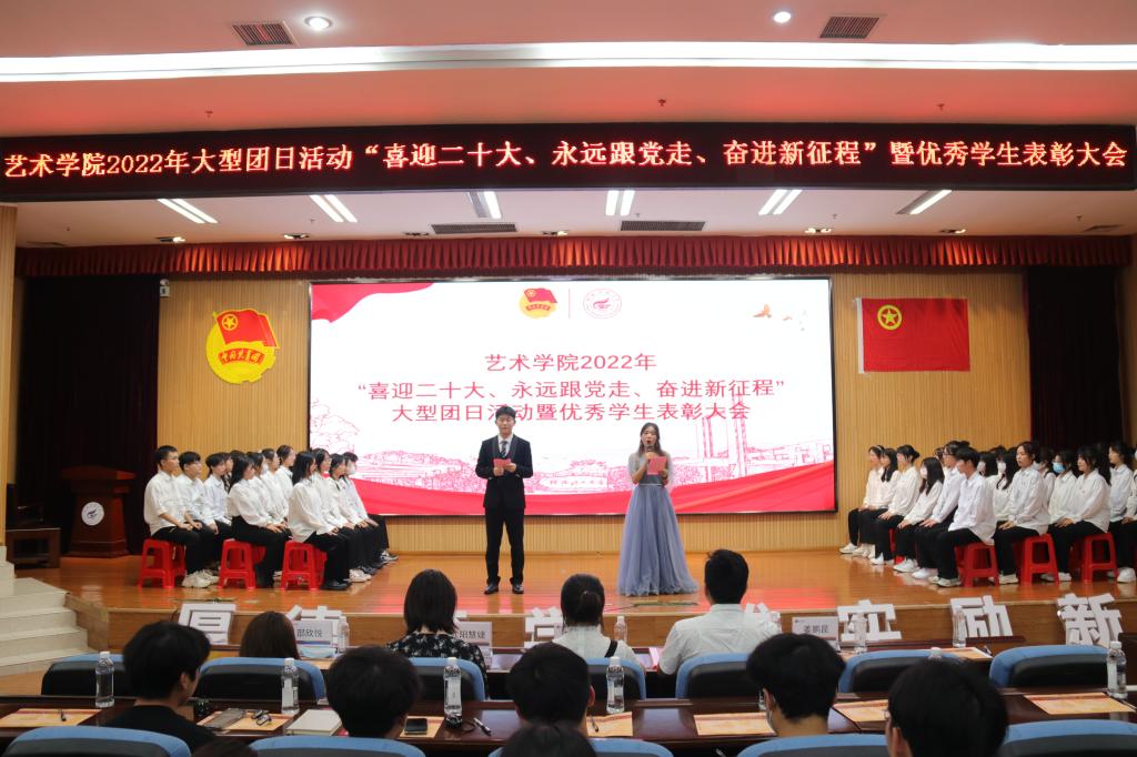 为迎接党的二十大胜利召开,深入学习习近平总书记在庆祝中国共产主义青年团成立100周年大会上重要讲话精神,5月19日晚,艺术学院在雁山校区图书馆报告厅召开“喜迎二十大,永远跟党走,奋进新征程”大型团日活动暨优秀学生表彰大会。艺术学院党委副书记苑守瑞、艺术学院学工组组长陈琳、艺术学院团委书记曹权玺,艺术学院辅导员姜鹏昆、邵欣悦、欧阳慧婕出席本次活动,参加活动的还有各学院团委组织部负责人、艺术学院各班团支书和团员青年代表。