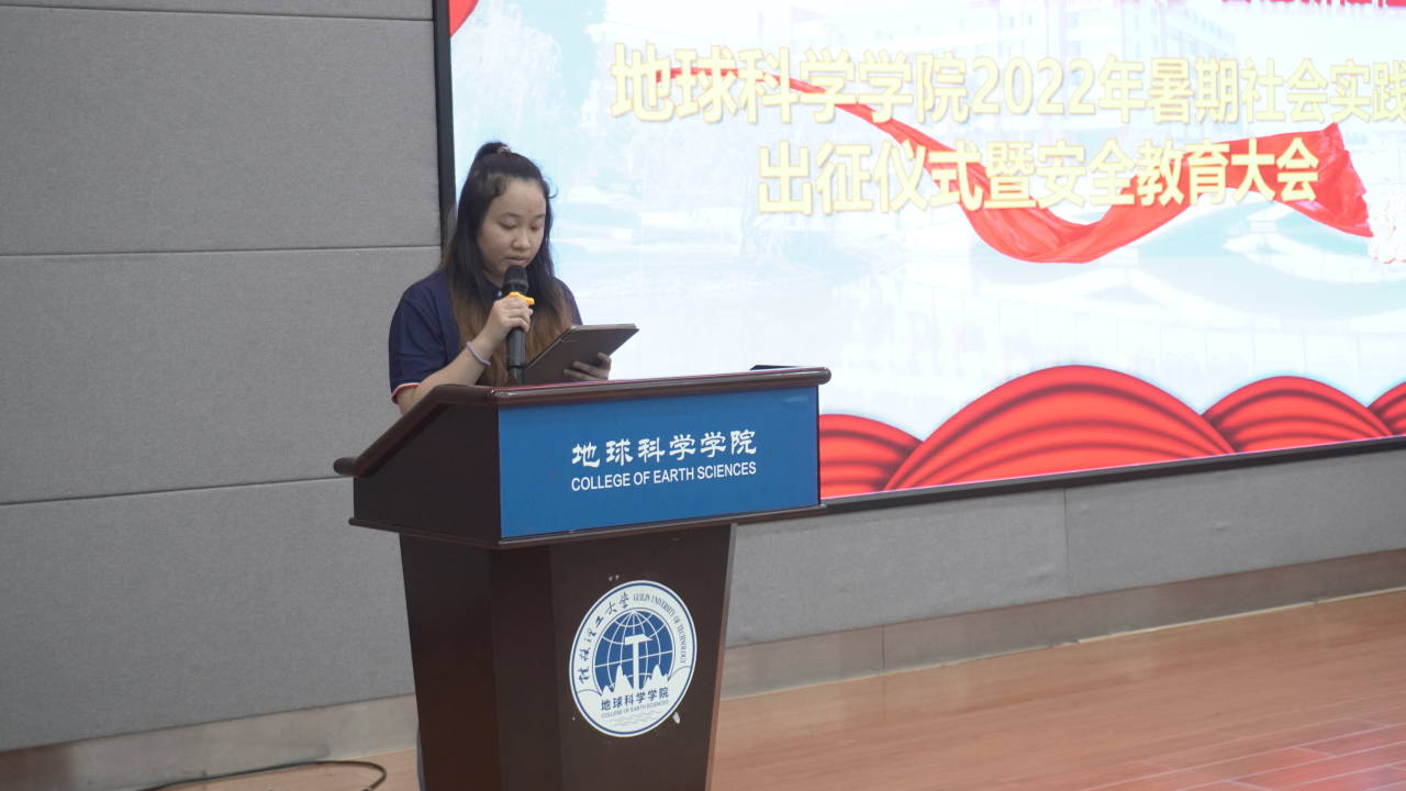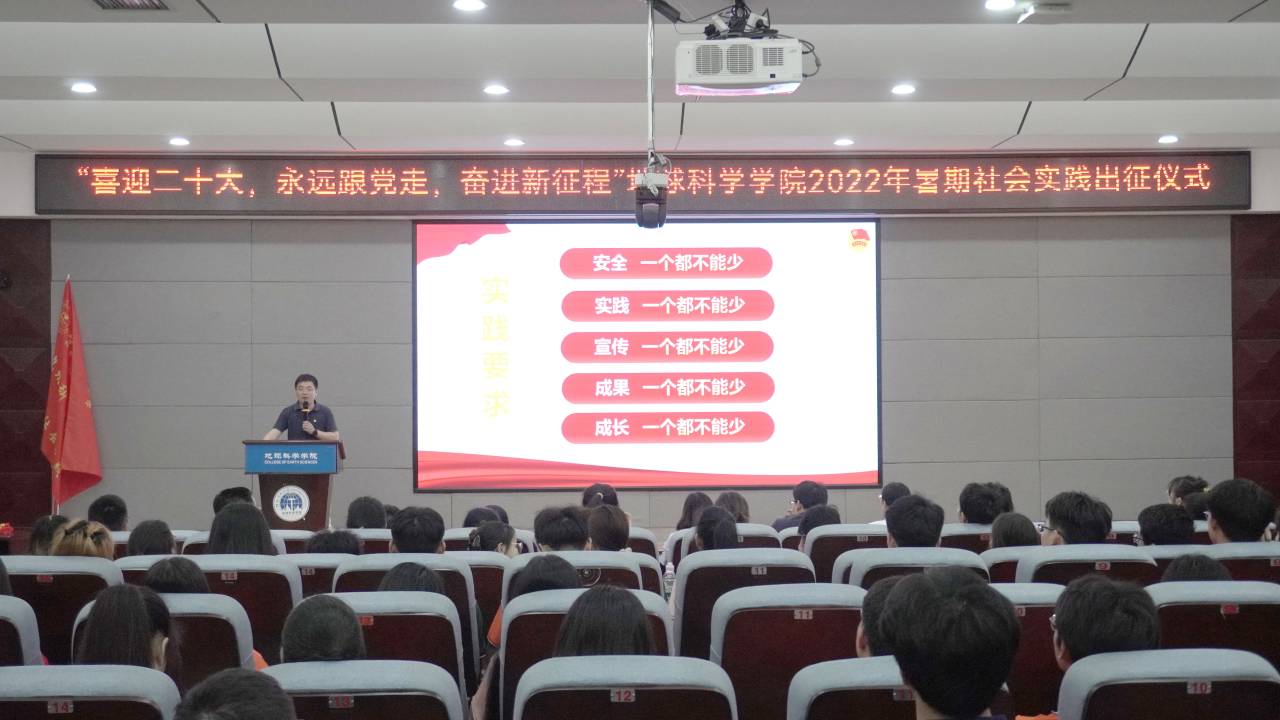 为贯彻落实习近平总书记关于青年工作的主要思想,引导青年积极参与社会实践,磨练意志、锤炼品格,在实践中“受教育、长才干、作贡献”。6月28日,地球科学学院于雁山校区逸夫楼01501报告厅举行2022年暑期“三下乡”社会实践活动出征仪式。地球科学学院党委副书记陶剑飞、团委书记吴田波、指导老师代表及五支实践队伍全体成员参加本次出征仪式。仪式由实践团成员胡靖悦主持。