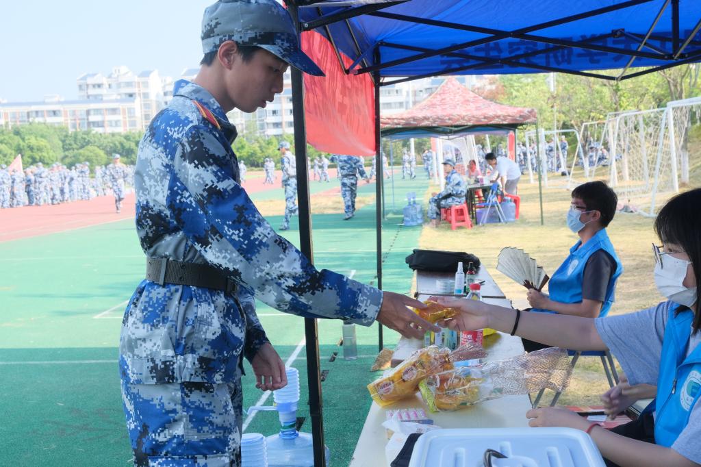 在军训期间,志愿者们积极为新生进行服务,提供矿泉水、食品和各种常用的医疗药品,他们主动积极帮助新生解决问题,为同学们献爱心。志愿者们也分享了自己的军训心得和经验,鼓励新生在训练中要发扬肯吃苦、不怕累的精神,严格按照教官要求完成训练,尽快适应军训,享受美好的大学生活。与此同时,学院各连队指导员也陪在新生身边,关心同学们军训期间的饮食作息,并就军训中遇到的各种问题进行耐心解答,叮嘱同学们要按时吃饭,注意身体,在军训中锤炼意志品质。