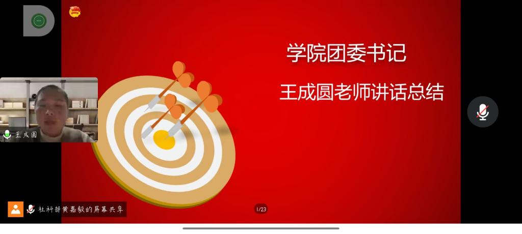 最后,学院团委副书记王成圆进行总结。在复杂的疫情防控形势下,每一位师生都要对自己的健康负责,没有一个冬天不可逾越,春天也终将会到来,相信在我们共同的努力下,我们的学习生活很快恢复正常,希望大家要踔厉奋发心向党,众志成城共抗“疫”。