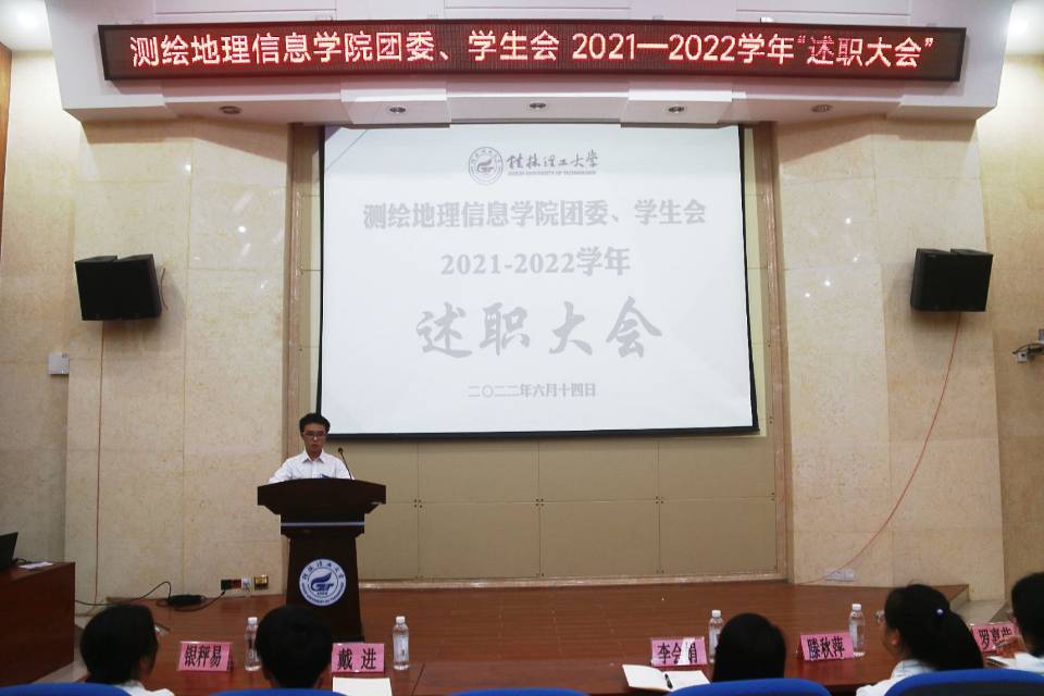 为进一步加强学生干部队伍建设,贯彻落实团委、学生会各项规章制度,6月14日晚,测绘地理信息学院在雁山校区12栋萃华楼报告厅组织开展2022年团委、学生会述职大会,学院团委副书记李会娟老师出席会议,学院团委、学生会全体成员参加会议。