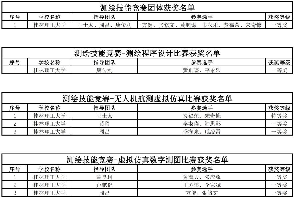 在竞赛前,学院为参赛团队提供了日常训练的场地和设备。参赛队员们经历了80多天昼出夜归的刻苦训练,在指导老师们的悉心指导和帮助下,在团队成员齐心协力的配合下,测绘地理信息学院7组学生在大赛中发挥出色,经过一天的紧张比赛,最终获得无人机航测虚拟仿真比赛特等奖1项,一等奖2项,虚拟仿真数字测图比赛一等奖3项,测绘程序设计一等奖1项,测绘技能竞赛团体一等奖1项的优异成绩。