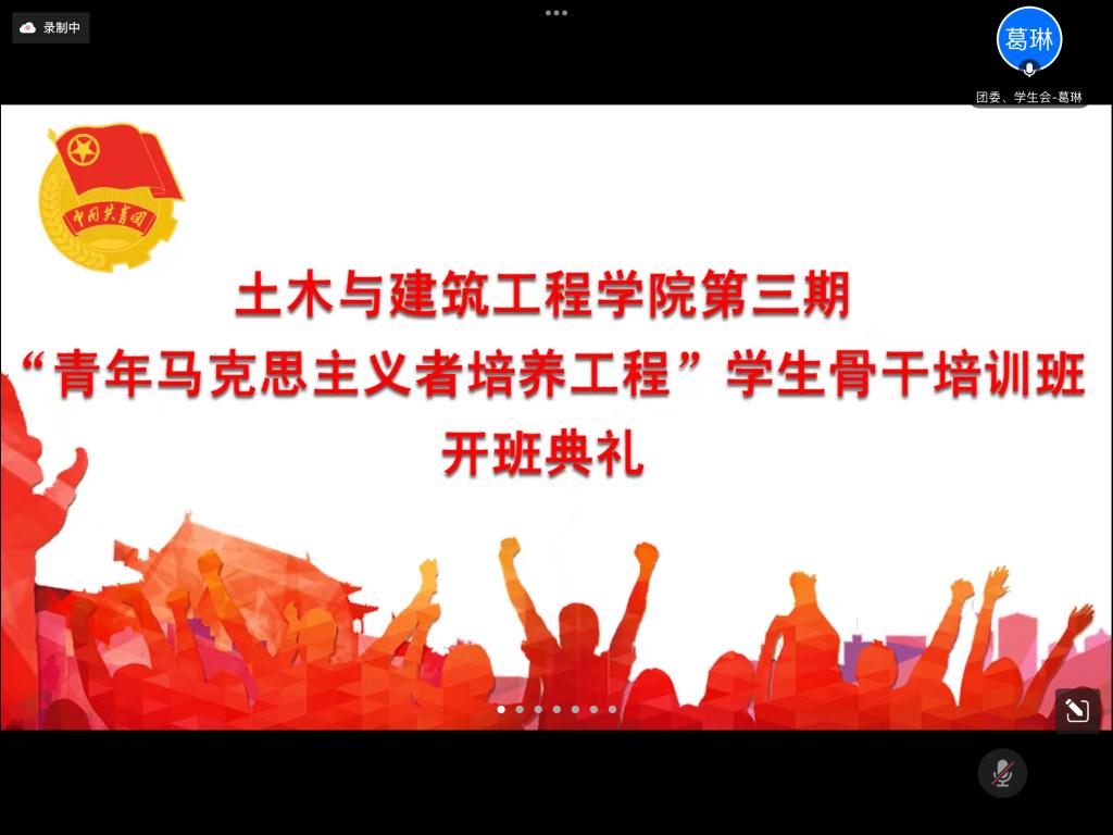 为深入学习贯彻党的二十大精神,以及习近平总书记关于对青年工作的重要讲话精神,扎实推进青年马克思主义者培养工程,土木与建筑工程学院于11月30日在线上开展第三期“青年马克思主义者培养工程”学生骨干培训班开班典礼,学院团委副书记安邦国老师、2021级辅导员张绪婷老师老师以及培训班全体学员参加了本次典礼,开班典礼由土木与建筑工程学院团委办公室负责人葛琳主持。