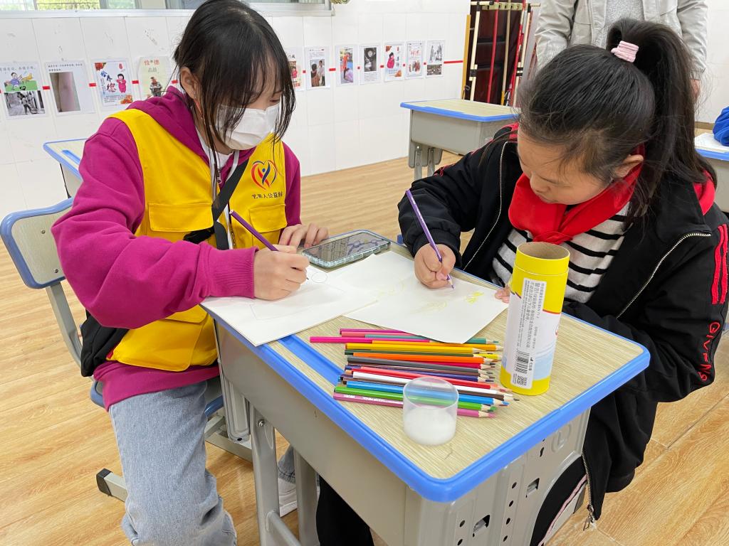 活动中,在特殊教育学校老师的引领下,学院青年志愿者与特殊学校的小朋友一对一结对共同参观特殊教育学校的校园,随后志愿者主动寻找合适的方法,让孩子们通过唱歌、手工绘画、书法、剪纸等艺术形式表现自己的个性发展。在活动过程中,小朋友们表现出了非常棒的专注度,将他们的想象力和对生活的美好憧憬跃然纸上。最终,一幅幅不失童真而又散发出蓬勃向上气息的作品呈现在了我们眼前。
