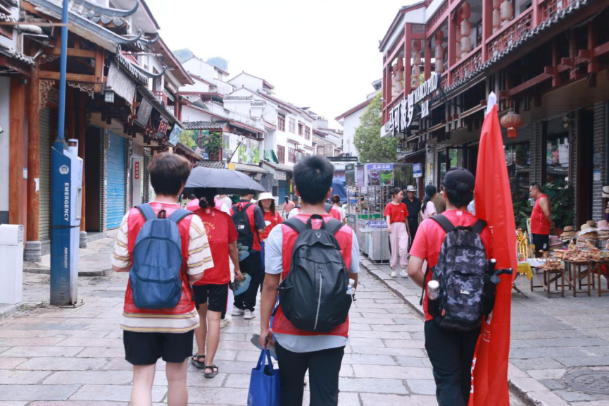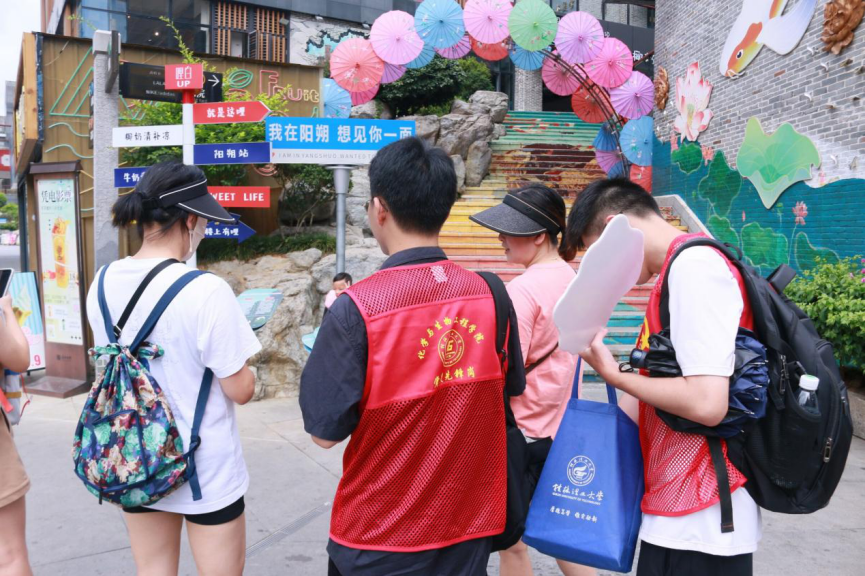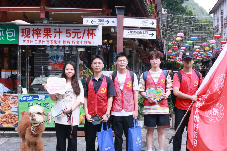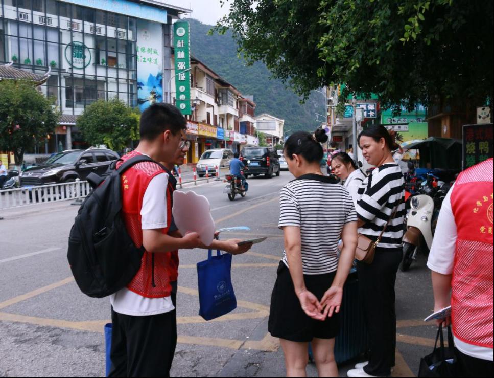 7月12日,为推动教育和语言文字事业高质量发展,加大民族地区、农村地区国家通用语言文字推广力度,全面提高国家通用语言文字普及程度和质量,并深入调研国家重点旅游城市及景区的普通话普及情况,beats365亚洲版弘扬中华汉语文化社会实践团于7月11日在桂林阳朔西街及周围景区开展普通话的推广宣传行动。实践团队成员通过街道走访、分发推普物资、对当地居民或游客进行访谈等方式开展普通话的推广宣传活动。团队成员在旅游高峰期开展推普宣传,访谈的受众面较广,同时也收集到了较多各类人群的问卷或问题反馈。