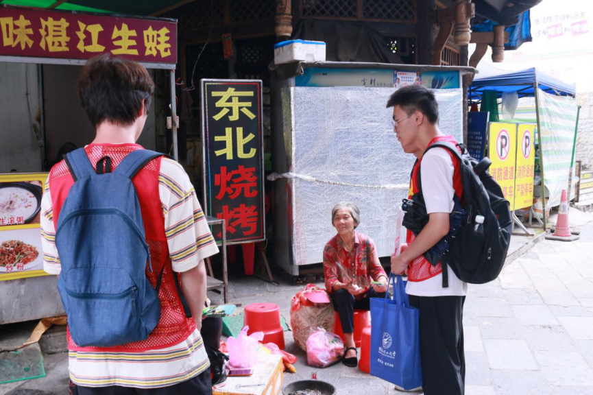 实践团队成员在与阳朔当地居民奶奶谈论游客使用普通话的情况