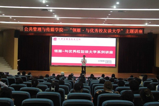 2023年10月20日晚,公共管理与传媒学院共青团委员会邀请优秀校友李嘉嘉在图书馆报告厅为同学们开展了以“‘领雁’——与优秀校友谈大学”的主题讲座。学院23级秋季学期入团积极分子,2022-2023级班长,团支书,院团委、学生会学生骨干等参加本次主题讲座,主讲人为优秀毕业生李嘉嘉。