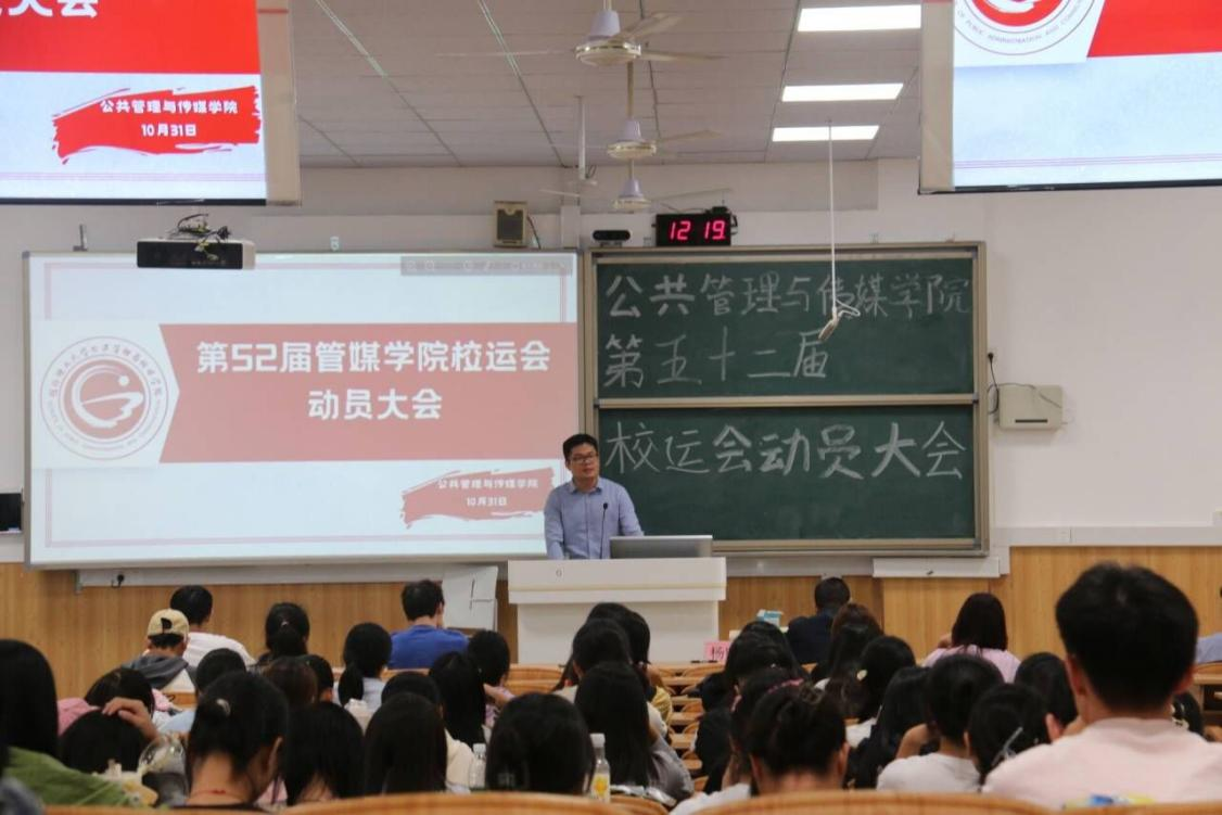 2023年10月31日,公共管理与传媒学院在雁山校区06105教室召开第五十二届校运会动员大会。公共管理与传媒学院党委副书记杨晓老师、团委书记石习杰老师、团委副书记莫田娟老师出席会议,全体运动员、护理人员、志愿者以及学院团委、学生会,易班全体工作人员参加此次会议。