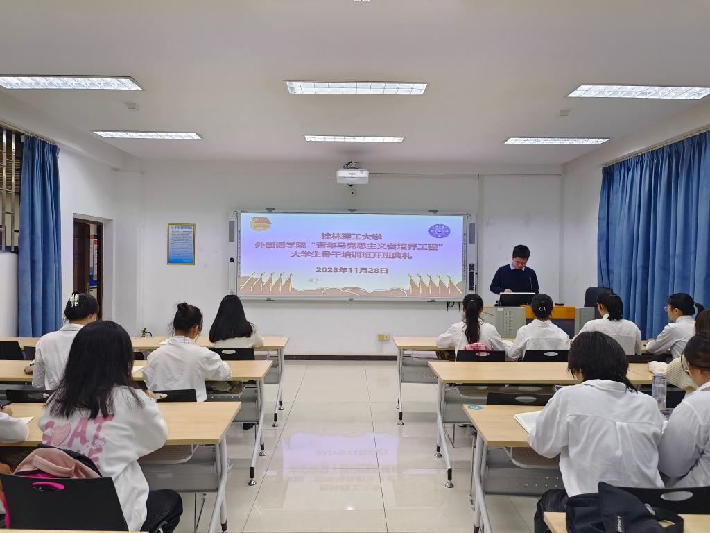 为深入学习贯彻习近平新时代中国特色社会主义思想和党的二十大精神,引导广大青年坚定不移听党话、跟党走,做信仰坚定的马克思主义者,11月28日晚,外国语学院在雁山校区04305会议室举行第四期青马工程培训班开班仪式,学院团委书记舒强老师、2020级辅导员李林军老师和学院第四期青马班学员参加开班仪式,开班仪式由舒强老师主持。