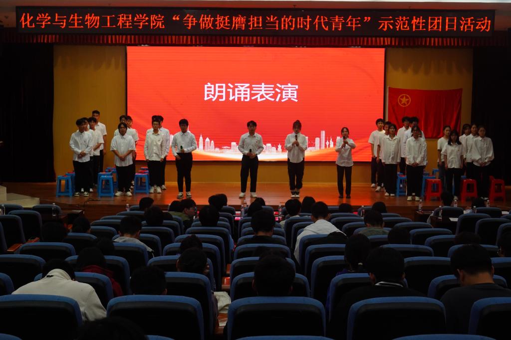 2023年11月25日下午,化学与生物工程学院在雁山校区图书馆报告厅举办以"争做挺膺担当的时代青年"为主题示范性团日活动。学院团委副书记王凯浩、兼职辅导员于湘老师,学院团委组织部负责人、新生班长、团支书和团员青年代表参加本次活动。