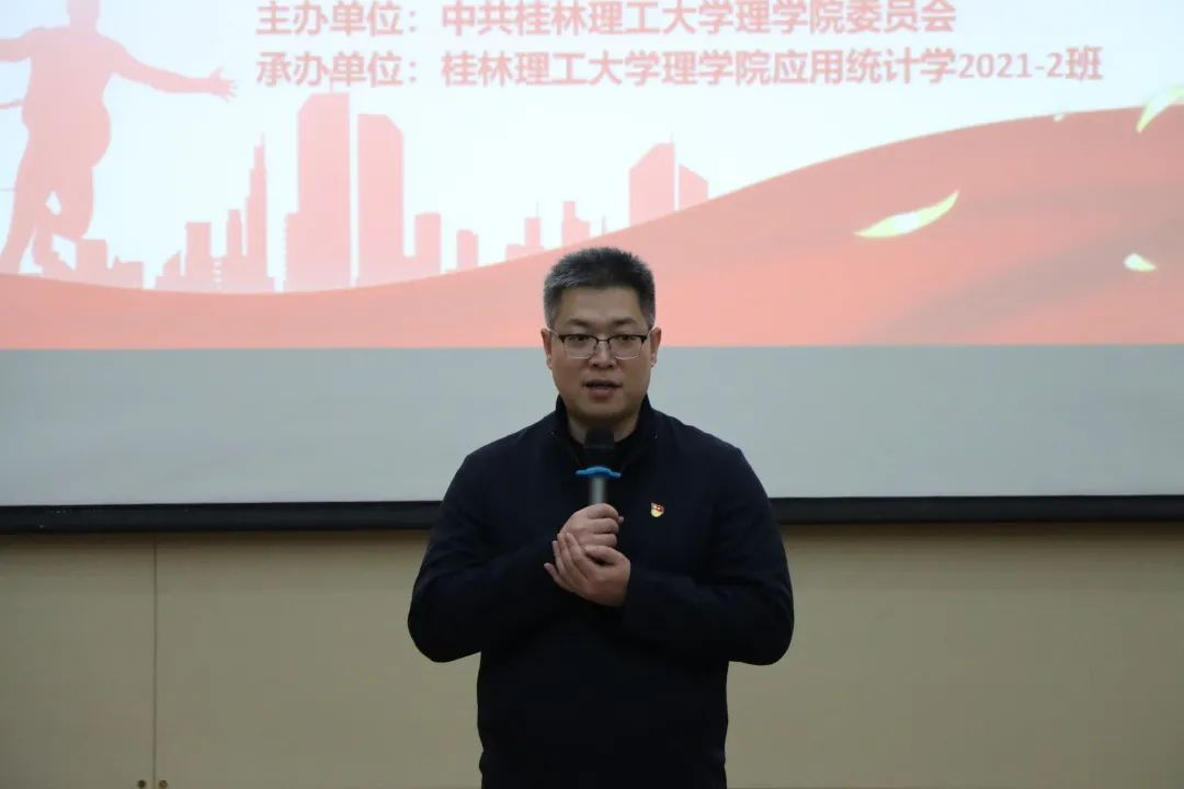 活动伊始,全体与会人员共同观看了习近平总书记在党的二十大报告中寄语广大青年的视频。紧接着,会议进行了党的二十大精神相关内容的有奖知识竞答。随后,应用统计学2021-2班学生李文艺、苏雨菲、冯泽洋、李登槐四名学生紧紧围绕主题社会实践、专业课程学习两个方面进行经验分享。班主任蒙秀芳老师也围绕班级建设、学业规划、安全教育来强调同学们要爱国、团结、奋斗、科学、互助。活动最后,学院党委副书记钟立军老师在会议上提出三点要求:第一,同学们要自觉践行党的二十大精神,以青春之我、奋斗之我,建设祖国,跑出我们这个时代的好成绩;第二,同学们要不断汲取专业知识,练就过硬本领,积极参加专业竞赛、科技比赛,将论文、科技成果应用在实现中国现代化的伟大事业中;第三,要立志做有理想、敢担当、能吃苦、肯奋斗的新时代好青年,在各行各业、不同领域要开拓创新、勇立潮头。