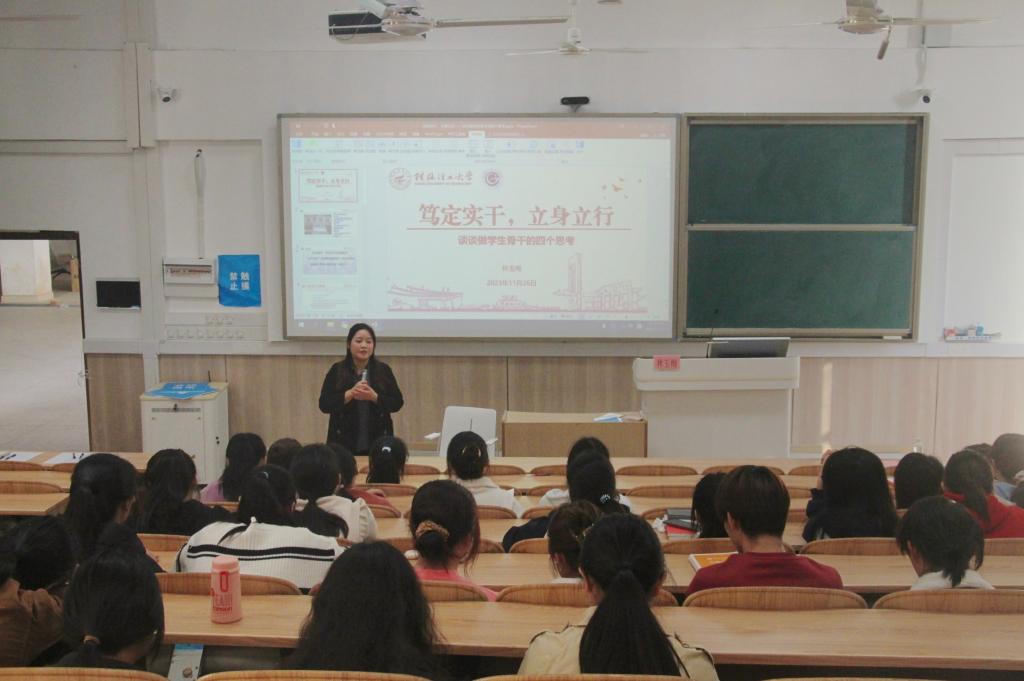 首先,林玉梅围绕“学生骨干的意义”“学生骨干的作用”“学生骨干的发展”“如何做好学生骨干”4个方面进行了讲述。其次,她与同学们分享了自己对担任学生干部的思考并为同学们提供了许多宝贵的经验和建议,表示“作为一名学生骨干,要抓学习,也要抓工作,两手抓,还得两手硬。”最后,林玉梅鼓励学生骨干,要磨练本领、修养内核,从个人和社会出发定位,成为一个独当一面的人,承担责任。