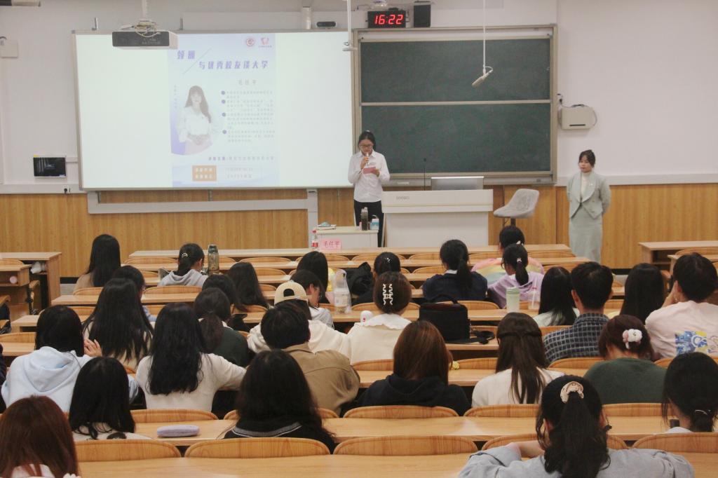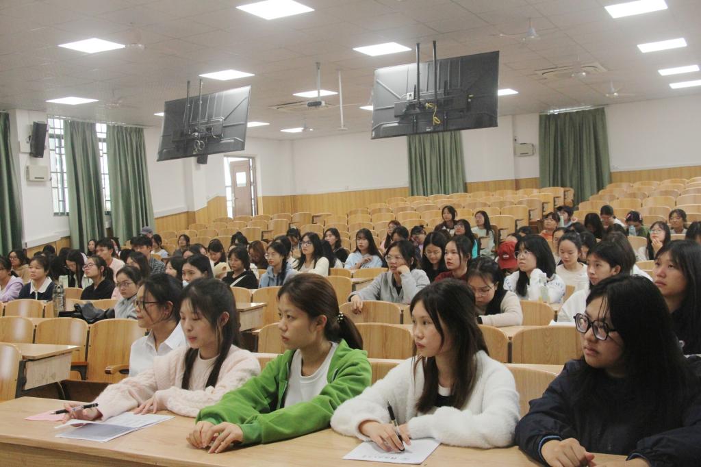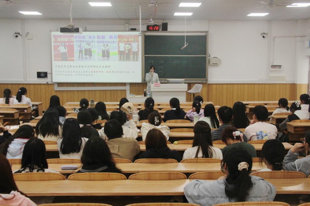 首先,毛任平分享了她在研究生期间参与支教的视频,讲述了自己在支教时期的所见、所学、所得。其次,她鼓励大家积极参与志愿活动、履行好学生骨干职责、丰富自己的大学时光,通过自身的奋斗让心中支教的种子发芽成长,最后成功投身于支教事业。最后,她寄语同学们要跟随光,靠近光,成为光,散发光。鼓励同学们在大学期间能够跟随光,靠近光,向优秀的学姐学长请教,能够为了自己小小的梦想而不懈奋斗,成为对社会、学校有用的人。