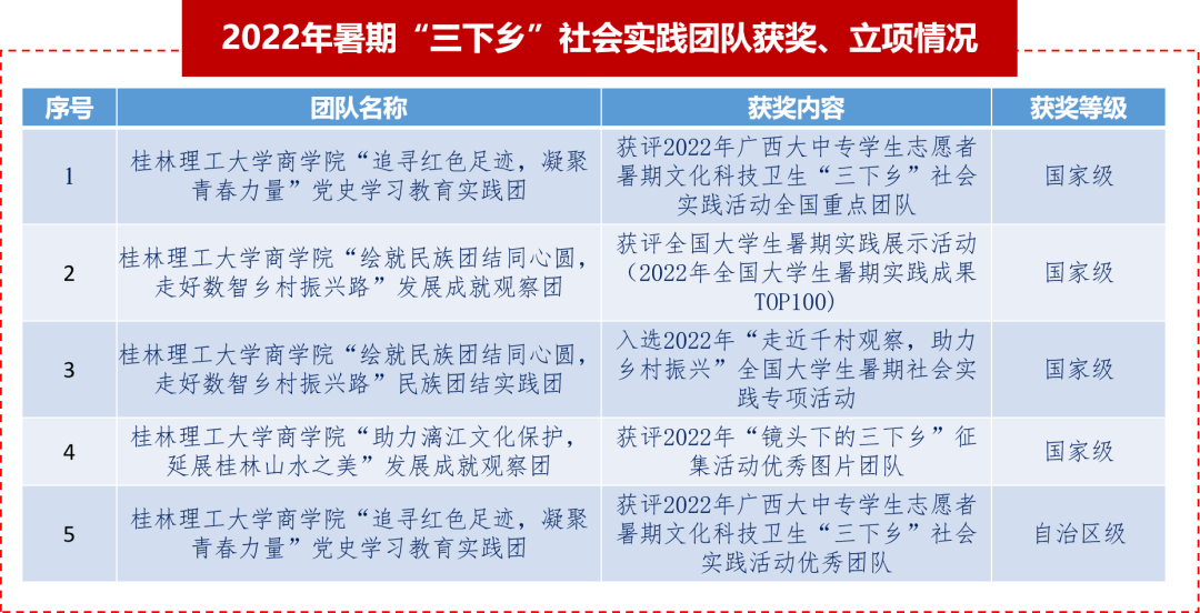 为深入学习贯彻习近平新时代中国特色社会主义思想,贯彻落实习近平总书记关于青年工作的重要思想,深入学习习近平总书记在庆祝中国共产主义青年团成立100周年大会上的重要讲话精神,引导和帮助广大青年学生上好理论与实践相结合的“大思政课”,在社会课堂中“受教育、长才干、作贡献”,坚定信念听党话、跟党走,2022年暑期,商学院以“喜迎二十大 永远跟党走 奋进新征程”为主题,围绕重温习近平总书记重要考察足迹、党史学习教育、理论宣讲、乡村振兴、发展成就观察等专题开展暑期“三下乡”社会实践活动,受到了各级各类媒体的宣传报道,获得社会的广泛关注。