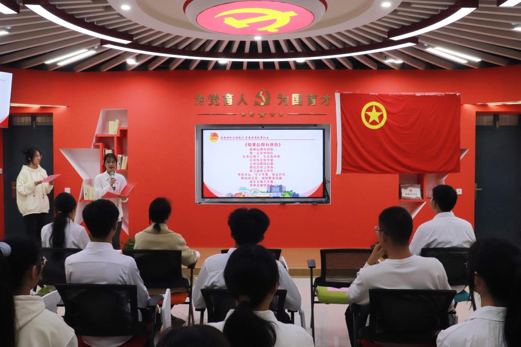 “思想旗帜引领航行 青春强国挺膺担当”示范性团日活动在全体师生奏唱《光荣啊!中国共青团》团歌歌声中拉开序幕,活动由团员青年集体朗诵《如果信仰有颜色》、集体合唱《我们的生活充满阳光》以及团委副书记慕宗良“挺膺担当”专题团课组成。