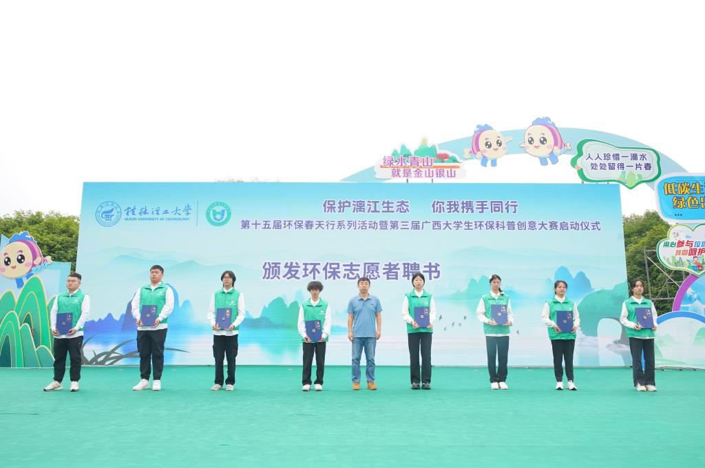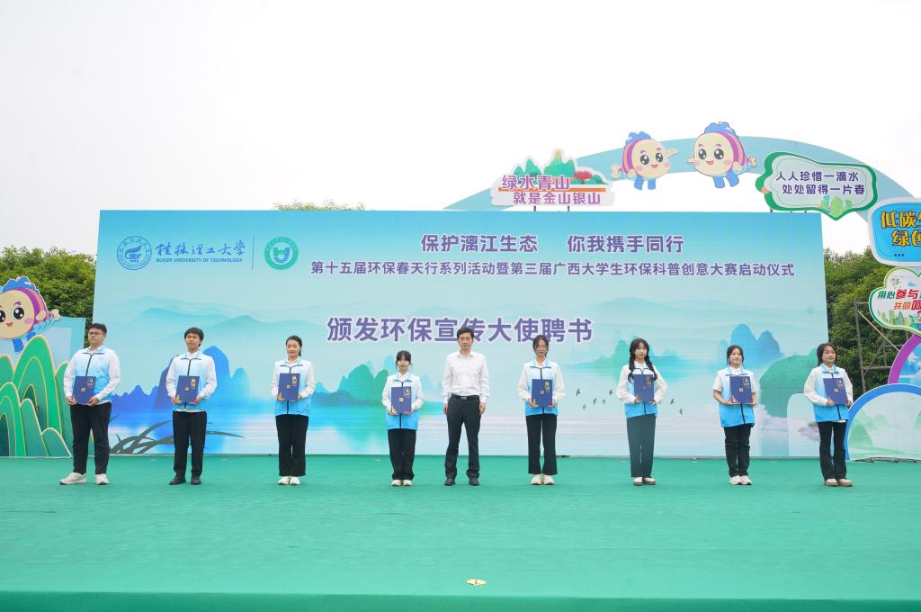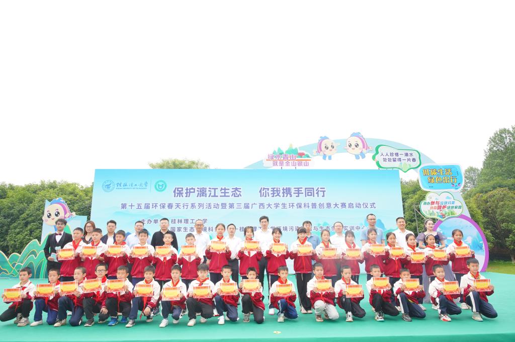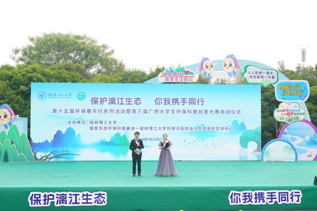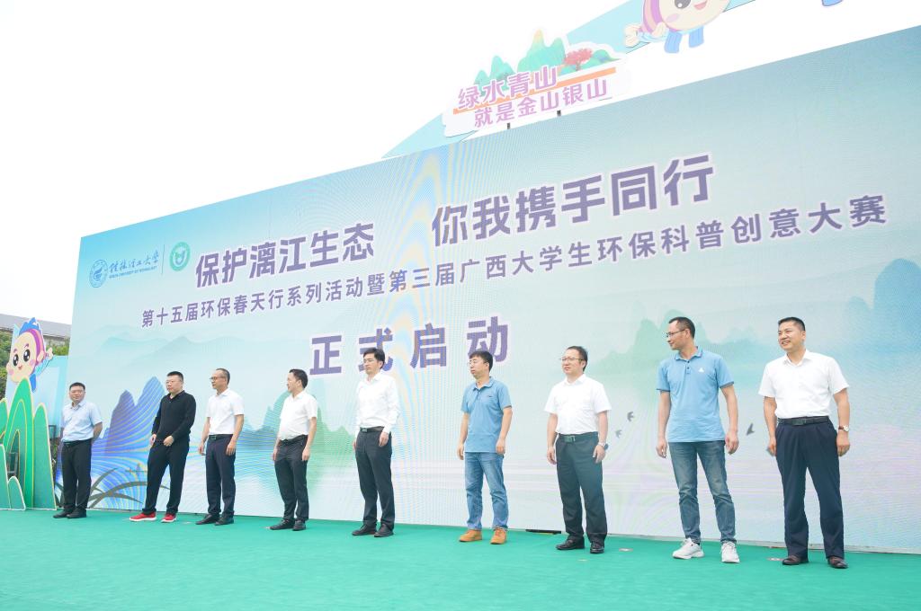 4月25日上午,在第三个桂林市“漓江保护日”到来之际,为深入贯彻落实习近平生态文明思想,提升广大青年学生环保意识,展现当代青年的环保担当与青春风采,由学校和国家生态环境科普基地—beats365亚洲版环境污染防治与生态保护实训中心主办的“保护漓江生态,你我携手同行”第十五届环保春天行系列活动暨第三届广西大学生环保科普创意大赛启动仪式在雁山校区举行。学校党委常委、副校长王磊出席活动并致辞,党委常委、宣传部部长叶昊,校长助理、党办校办法务办主任张成龙,广西环境科学学会秘书长王晓飞,桂林市生态环境局、兴安县生态环境局有关领导,各兄弟院校相关领导和嘉宾、学校相关职能部门负责人出席活动,广西大学生环保科普创意大赛参赛代表以及桂林市大埠中心校师生代表参加活动。