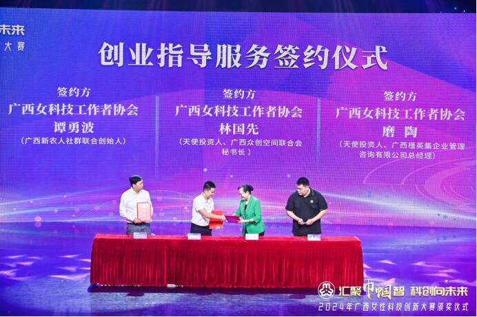 颁奖现场,还进行了优秀获奖项目路演展示。建设银行广西分行向获奖企业及获奖代表提供50—300万元不等预授信贷款额度,广西女科技工作者协会与创业导师签约,创业导师将为获奖项目团队提供后续跟踪指导服务。