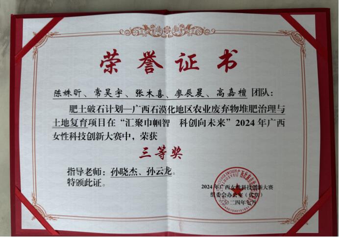7月31日,“汇聚巾帼智 科创向未来”2024年广西女性科技创新大赛颁奖活动在南宁顺利举行。2024年广西女性科技创新大赛是一项展示女性智慧与科创魅力的高水平竞赛。此次比赛吸引了广西的众多优秀女性团队参与。其中,由孙晓杰、孙云龙老师指导的团队——陈姝昕、常昊宇、张木喜、廖辰晨、高嘉檀等五名同学在此次大赛中表现优异,荣获全区三等奖。