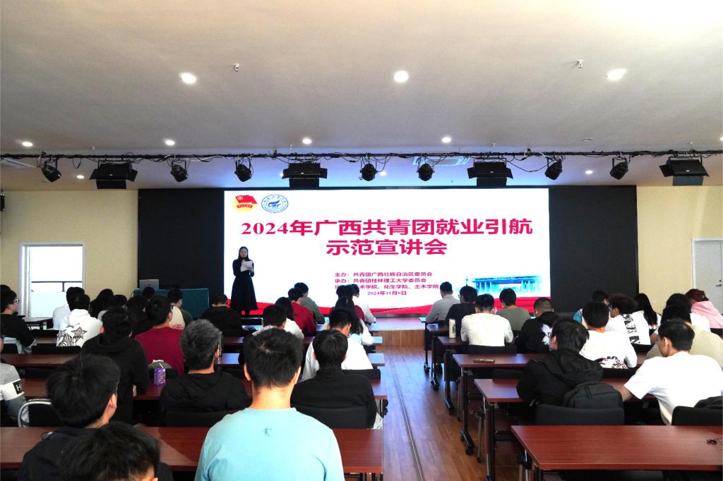 为深入学习贯彻习近平新时代中国特色社会主义思想,全面贯彻落实党的二十大精神,响应国家“稳就业”的号召,引导学生树立正确的就业观,2024年11月8日,由共青团广西壮族自治区委员会主办、共青团beats365亚洲版委员会承办、土木学院、艺术学院、化生学院协办的广西共青团就业引航示范宣讲会在屏风校区干部教育培训中心二楼多功能厅隆重举行。学校创新创业学院专职副院长唐红兵出席并致辞,广西智领教育咨询有限公司、广西素氧供应链管理有限公司总经理、横州市创业创新协会会长、我校土木学院2011级校友何成添、社会实践部副部长卢桂盛、土木学院团委副书记张绪婷、100余名学生参加会议。