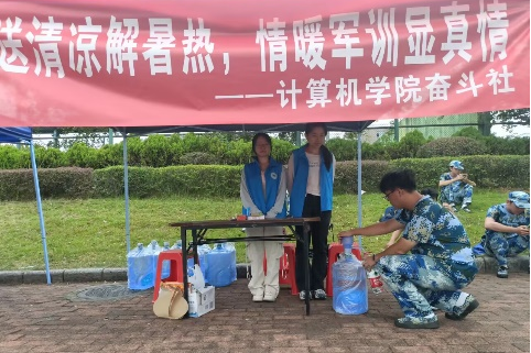 志愿服务源于心,献出爱心在于行。奋斗社各部门积极参与、团结协作,为军训学生送上了丝丝甘甜和暖心关怀。志愿者们在足球场入口处搭建帐篷,设置志愿服务点,负责后勤的志愿者将物资送到服务点,为教官和新生提供水源补给,为身体不适的同学提供热水以及葡萄糖、藿香正气水等药物,给他们提供阴凉休息的地方,在一定程度上缓解了新生的不适。此外,志愿者们积极地与学弟学妹们交流,为他们解答一些生活中的问题,他们的身影成了军训期间一道亮丽的风景线。