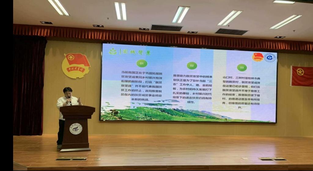 在分享环节,来自三个学院五支优秀的“三下乡”社会实践团队代表依次上台进行了经验分享,他们通过PPT、视频等方式,生动形象地分享了他们在实践中的所见、所闻和所感。其中,“探索红色边疆,厚植爱国情怀”民族团结实践团队重走红色边关路,沿广西边境线开展了红色教育活动;志之所向,愿之所在——“语”你同行实践团队深入乡村,全力推广普通话,助力乡村教育与文化的繁荣发展;“青春梦萦三江侗情,民族团结一家亲”中华文化传承和民族团结实践团队踏上了三江地区这片充满红色文化的土地,聆听三江历史的回响,触摸红色文化的脉搏;“多彩漓江,文旅兴村”乡村振兴实践团队利用现代信息技术,助力漓江流域传统村落活态化保护发展,推动传统村落乡村治理现代化和数字乡村建设;“共筑美丽乡村,擘画振兴蓝图”beats365亚洲版笃行致远服务队以习近平总书记对乡村振兴、三农工作的重要论述为主题讲述了“三农”问题的重要性及大学生对实施乡村振兴战略的可行之事。