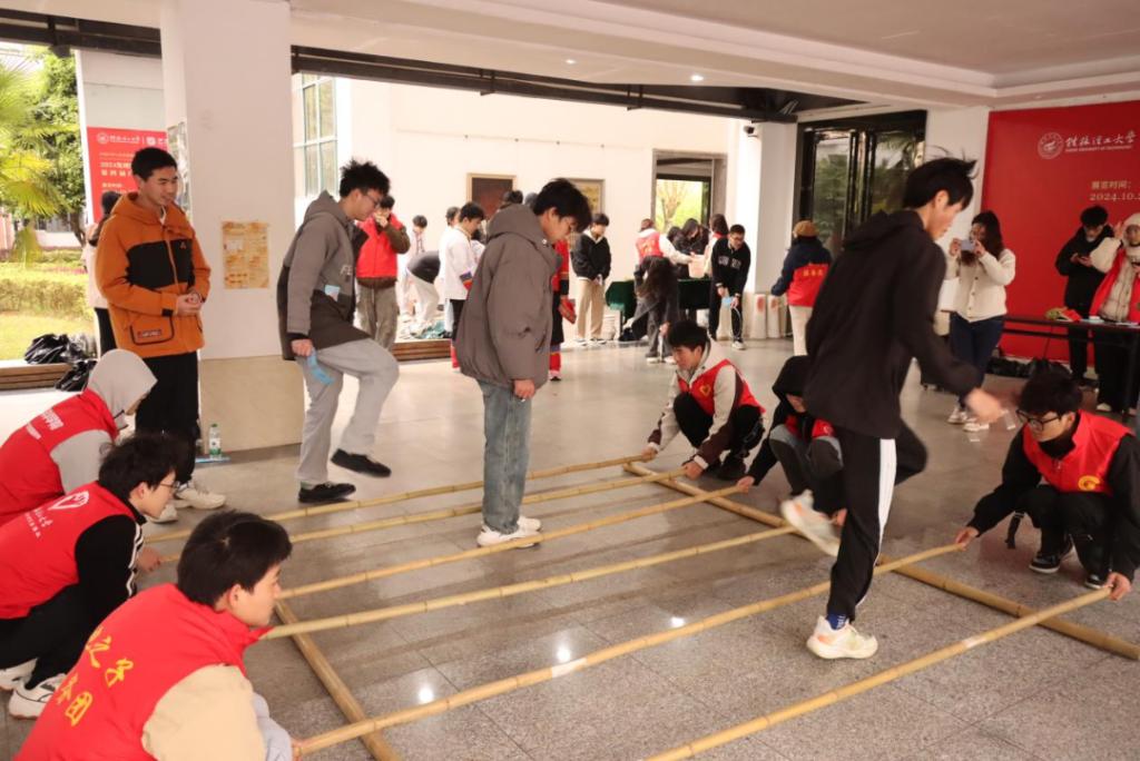 在雁山校区三栋广场,地球科学学院举办了“广西三月三”民族团结“睛”彩游园民俗体验活动。本次游园民俗体验活动设置了竹竿舞、抛绣球、射箭挑战、滚铁圈、走板鞋、民族元素拼图等六个项目,通过“文化体验+趣味竞技”的形式展开,吸引了200余名学生的热情参与,让学生们在共居、共事、共学、共乐的和谐校园氛围中,通过具体的实践体验活动感受民族文化的独特魅力。
