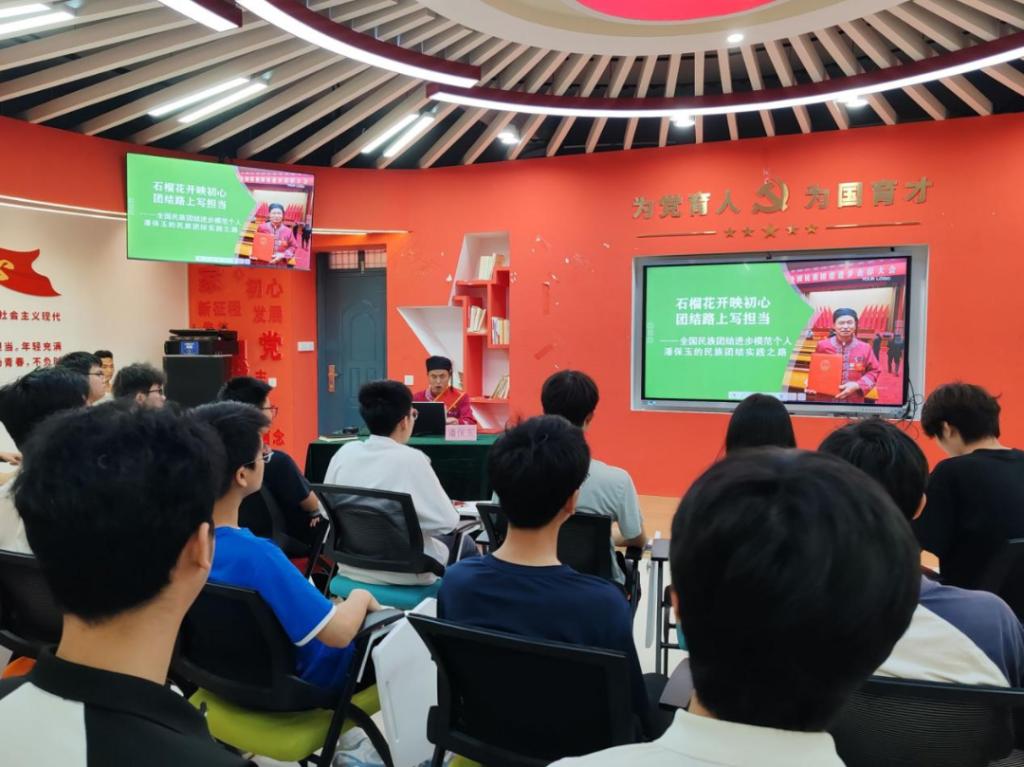 在嘉园“一站式”学生社区思政大讲堂,地球科学学院举办了一场别开生面的民族团结进步事迹分享会。此次讲座特别邀请到2024年“全国民族团结进步模范个人”、桂林市龙脊镇大寨村原村委主任、党支部书记潘保玉同志,为同学们带来主题为《石榴花开映初心,团结路上写担当——全国民族团结进步模范个人潘保玉的民族团结实践之路》的精彩分享。潘保玉书记结合自身经历,从探索乡村发展路径、带领村民脱贫致富、传承民族文化以及投身家乡公益等多个方面出发,讲述了其在民族团结进步事业中的生动实践与显著成就。同学们从分享事迹中深刻理解了铸牢中华民族共同体意识的重要意义,感受到了民族团结凝聚的强大力量,也更加明确了自己在新时代民族团结进步事业中的责任与担当。