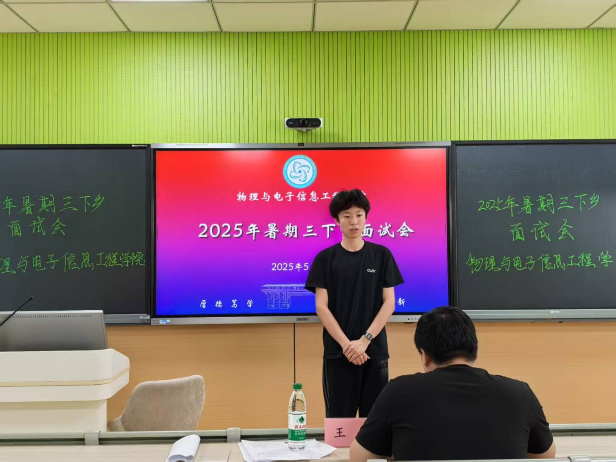 为选拔兼具专业素养与社会责任感的优秀学生,深入基层开展科技助农、科普教育等实践活动,5月9日,我校物理与电子信息工程学院在雁山校区06308、06305教室组织开展了暑期“三下乡”社会实践队员选拔面试。学院团委副书记王发,辅导员郭泉、钟博航担任评委。