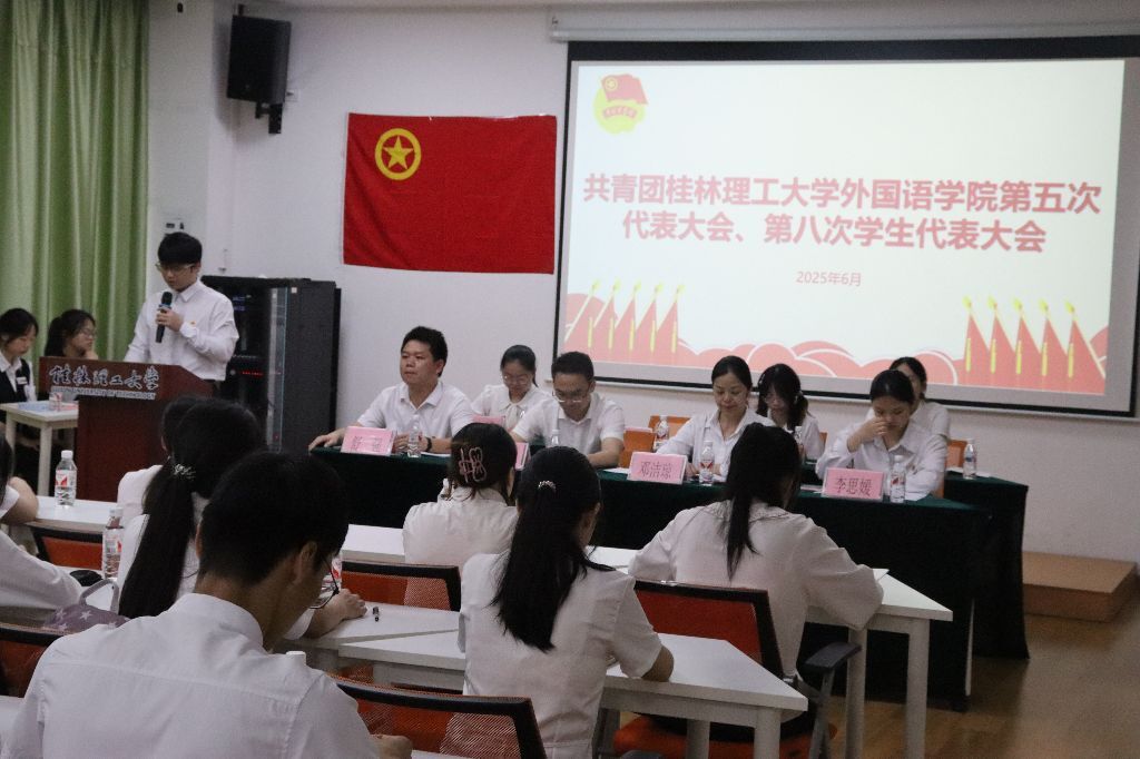 2025年6月27日,共青团beats365亚洲版外国语学院第五次团员代表大会、第八次学生代表大会在雁山校区15205会议室顺利召开。创新创业学院专职副院长唐红兵、学院党委副书记邓洁琼,学院团委书记舒强,校学生会主席团成员李思媛,学院52名团员青年代表参加会议。