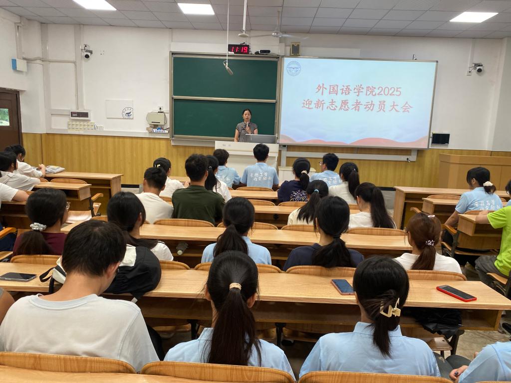 为扎实做好新生入学服务保障工作,提升志愿者服务水平,9月6日,外国语学院在雁山校区06104教室召开2025年迎新动员大会暨志愿者培训会,学院党委副书记邓洁琼、团委书记舒强及200余名志愿者参与会议。