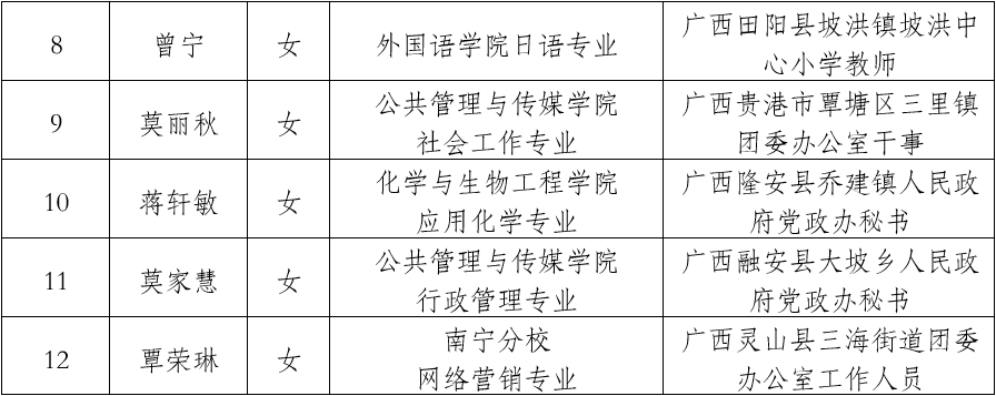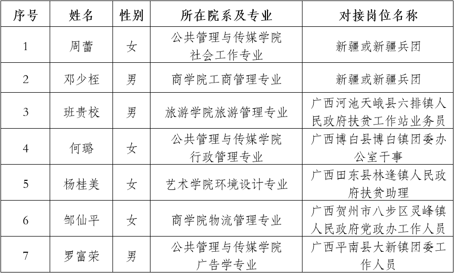 根据团中央、教育部、财政部、人力资源社会保障部《2018—2019年度大学生志愿服务西部计划实施方案》及自治区项目办《关于认真做好2018-2019年度广西西部计划招募派遣工作的通知》的文件精神,经学生个人申请,二级学院团委推荐,beats365亚洲版审核并组织笔试、面试、体检、公示等严格选拔程序,最终录取12名同学为我校2018年大学生志愿服务西部计划志愿者,现将名单(排名不分先后)及岗位对接情况公布如下: