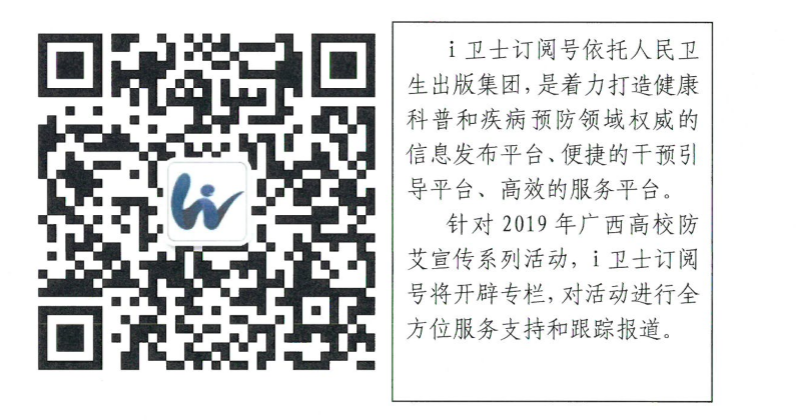 2、答题加分。后台统计参赛学校进入i卫士订阅号一“广西.专题”一“大学生艾防进行时”“艾知问答”板块答题的人数和正确率(统计截至11月20日16:00),按答题人数占学校总学生人数比例(最高按60%计)*正确率*50获得相应加分,满分30分。i卫士订阅号简介及二维码如下:
