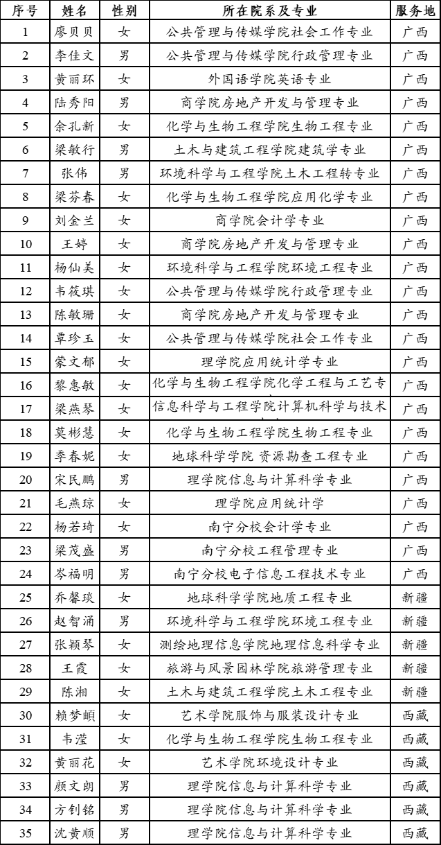 根据自治区项目办《关于认真做好2021-2022年度广西西部计划志愿者招募派遣工作的通知》的文件精神,按照公正、公平、公开、择优原则,我校进行了西部计划志愿者的招募与选拔工作,通过公开招募,学生个人申请,二级学院团委推荐,beats365亚洲版组织笔试、面试,最终确定拟录取34名学生及5名替补学生(若入选学生遇特殊情况无法参加西部计划,则由替补同学按顺序依次替补),现将名单公示如下: