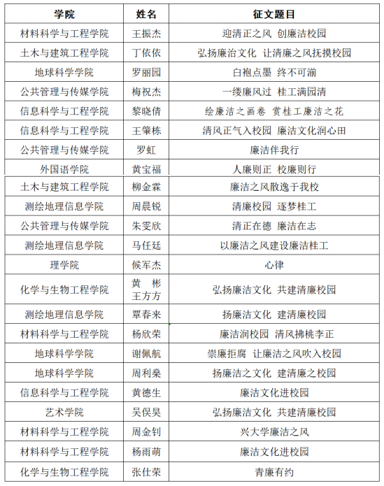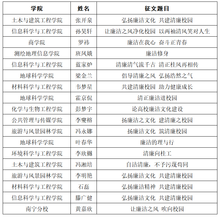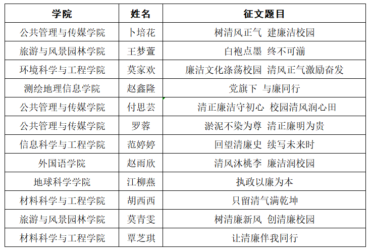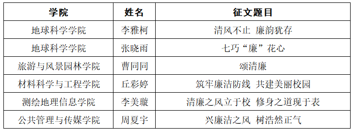 为深入学习贯彻党的二十大精神和习近平总书记系列重要讲话精神,扎实推进清廉校园建设,营造崇廉拒腐、尚俭戒奢、风清气正的校园文化氛围。根据beats365亚洲版“弘扬廉洁文化共建清廉校园”主题征文比赛通知要求,经学生自主报名、各学院团委推荐、专家评审等环节,最终评选出一等奖6名、二等奖12名、三等奖18名、优秀奖24名,优秀组织奖3名,现将评选结果予公示如下: