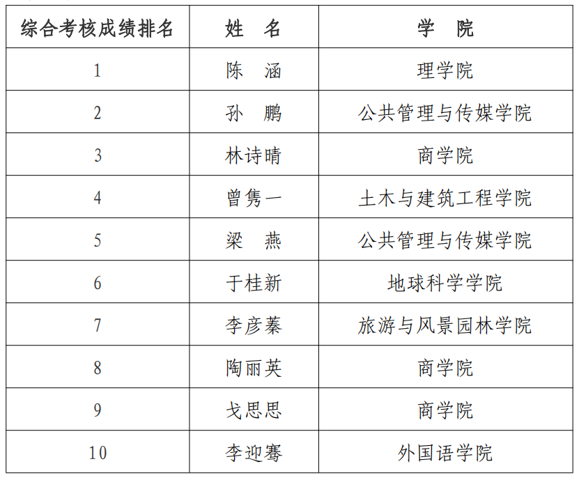根据《关于组建中国青年志愿者第 26 届研究生支教团(2024—2025 年度)有关工作的通知》(全国项目办发〔2023〕3 号)等文件要求,经学生自主报名,学院组织推荐,学校西部计划项目办组织笔试、面试综合考核,现将综合考核成绩前 10 名按照从高到低的顺序公布如下: