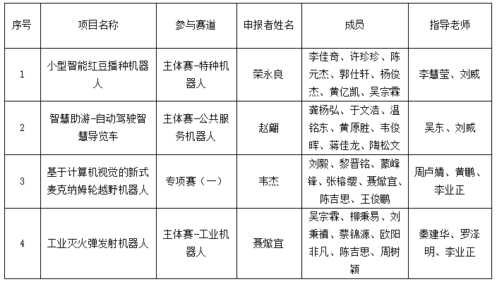 根据2024年全国大学生机器人科技创新交流营暨大赛的有关要求,经资格审查、专家评审,推荐《小型智能红豆播种机器人》等4个项目参加2024年全国大学生机器人科技创新交流营暨大赛,现将参赛项目具体信息公示如下: