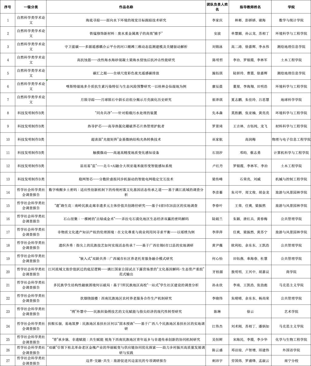 根据共青团广西区委、自治区教育厅、自治区科协、广西学联《关于组织开展第十二届“挑战杯”广西大学生课外学术科技作品竞赛的预通知》要求,经学生自主申报、学院初评、校级决赛等环节,秉承公平公正公开原则,现拟推荐27个作品参加第十二届“挑战杯”广西大学生课外学术科技作品竞赛主体赛,作品公示如下。